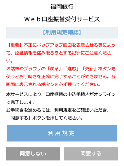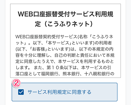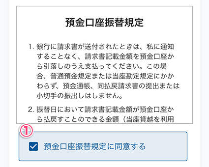 利用規定の内容をご確認し、「預金口座振替規定に同意する」「サービス利用規定に同意する」をチェックします。