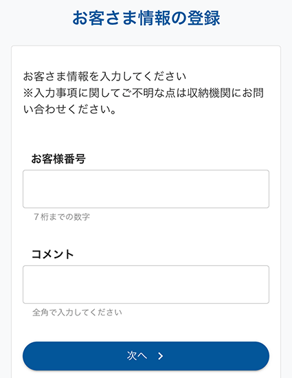 チラシの二次元バーコード・HPのURL等、収納企業さまから案内された方法で申込みサイトへアクセスし、以下の手順で口座振替のお申込みを行います。