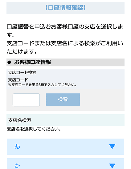 口座振替(引き落とし)を行う口座の支店を選択します。