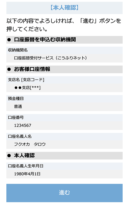 「支店名」「口座番号」などの確認画面が表示されますので「進む」を選択します。